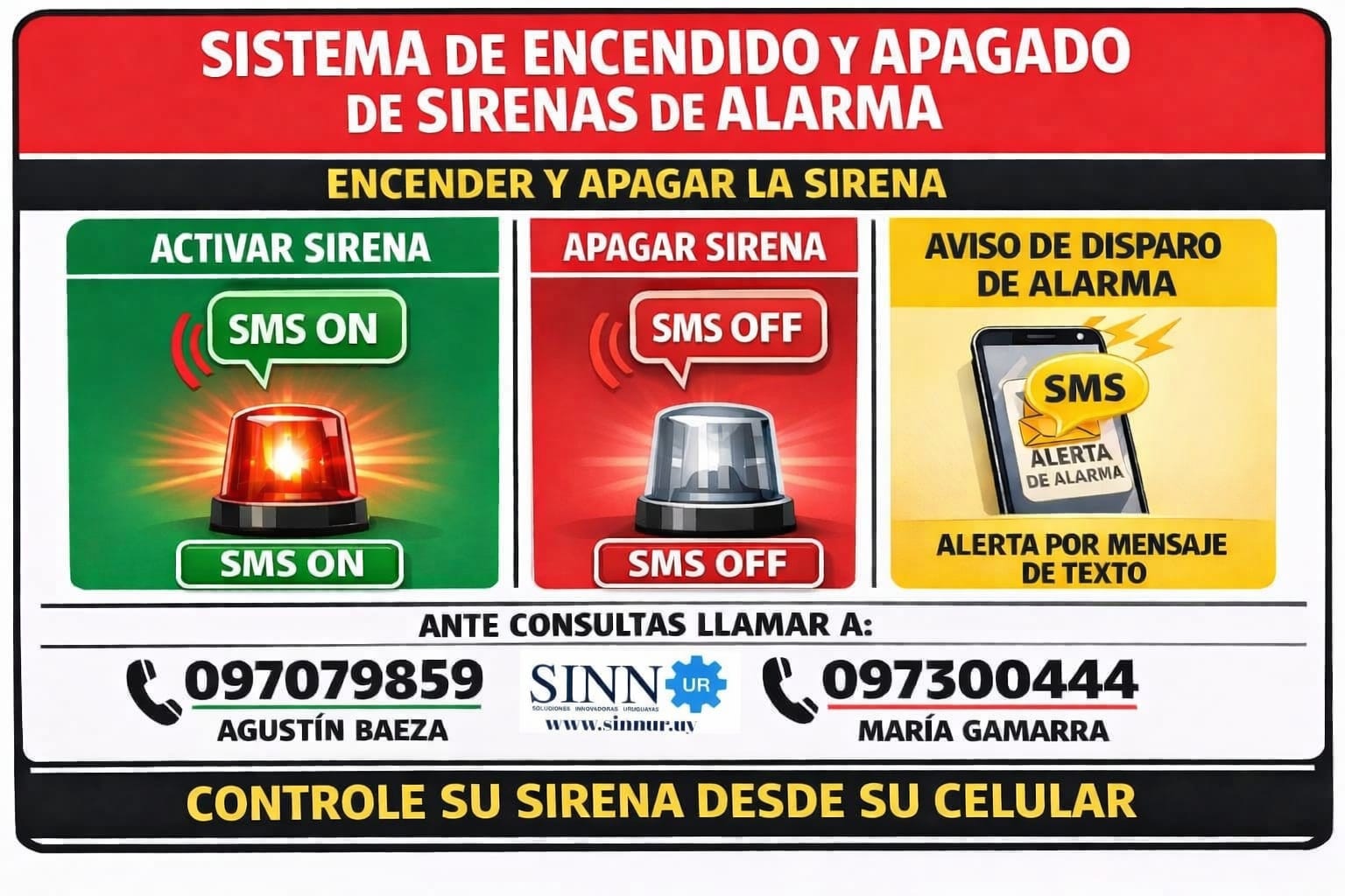 El sistema permite controlar la sirena de cualquier alarma mediante sms de su hogar o comercio.